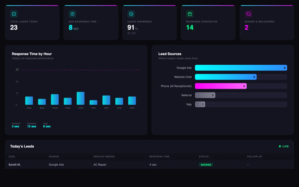 Three prospects come in from Google Ads while you're in back-to-back meetings. By the time you check your phone at 5 PM, they've already gone with someone else. Speed-to-response is everything - and you can't answer every call when you're running the business.